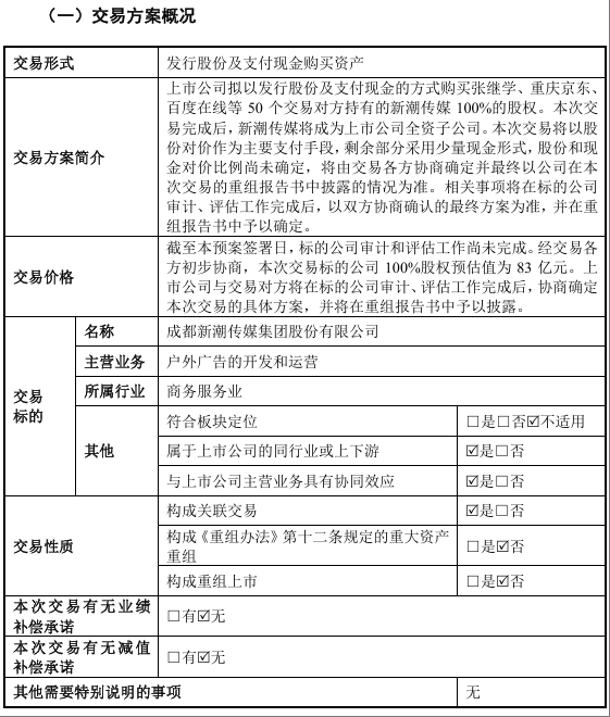 4月9日晚间,分众传媒4公告,公司拟以发行股份及支付现金的方式购买张继学、重庆京东海嘉电子商务有限公司、百度在线网络技术(北京)有限公司等50个交易对方持有的成都新潮传媒集团股份有限公司(下称“标的公司”)100%的股权。