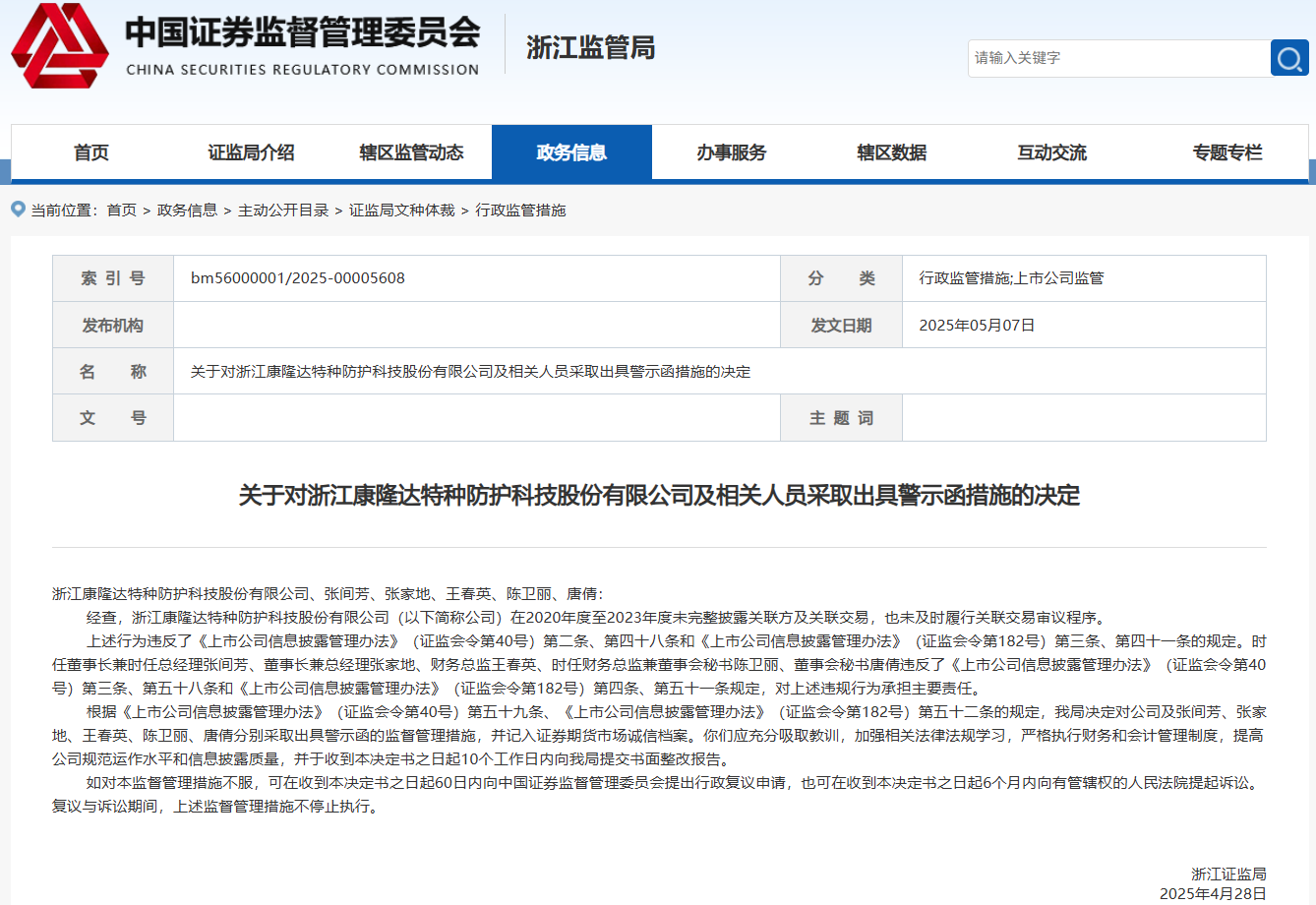 5月7日,浙江证监局发布公告,对康隆达(603665)及相关人员采取出具警示函的措施。