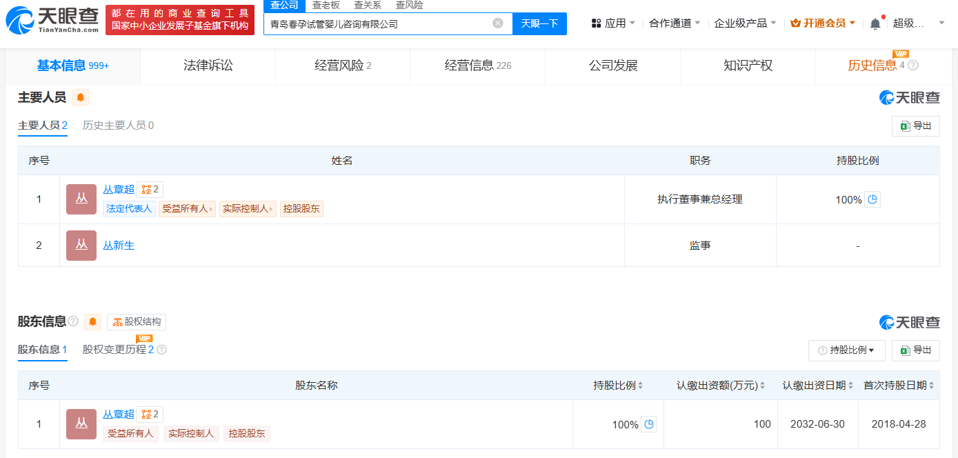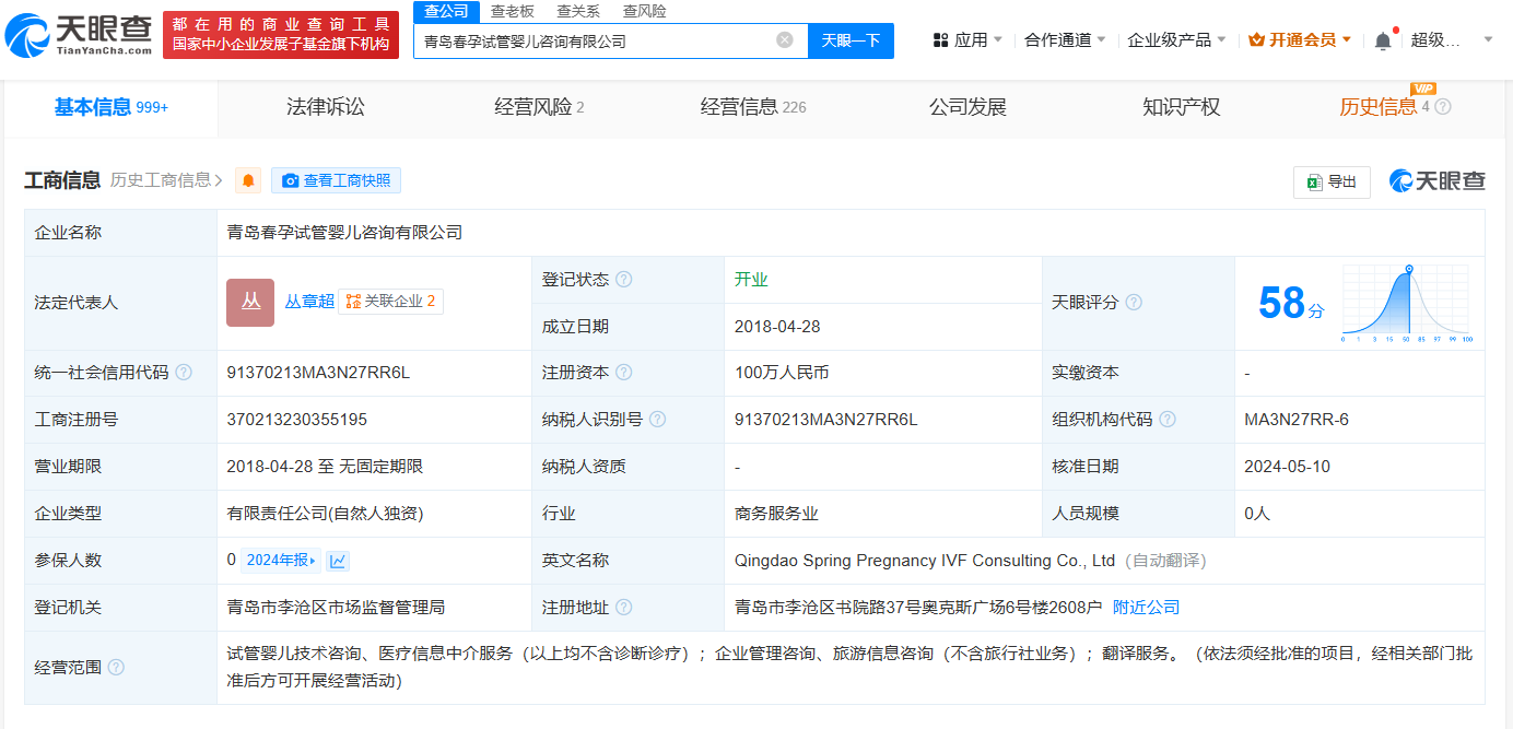 该公司成立于2018年4月,法定代表人为丛章超,注册资本100万人民币,经营范围包括试管婴儿技术咨询、医疗信息中介服务等,由丛章超全资持股。风险信息显示,2024年8月,该公司已因通过登记的住所或经营场所无法与企业取得联系,被青岛市李沧区市场监督管理局列入经营异常名录。