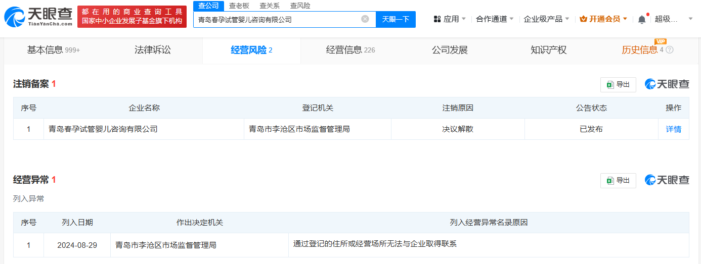 天眼查App显示,近日,青岛春孕试管婴儿咨询有限公司新增一条注销备案公告,公告期为5月14日至6月28日。