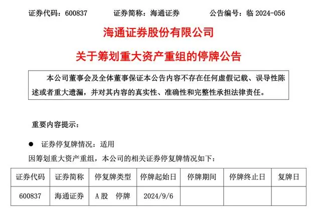 9月5日晚,海通证券、国泰君安均发布关于筹划重大资产重组的停牌公告。