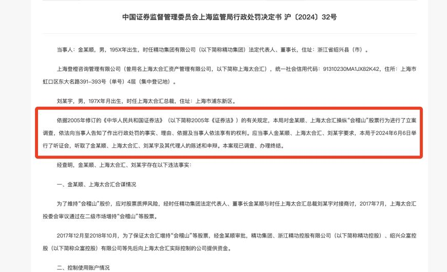 罚单介绍,为了维持“会稽山”股价,应对股票质押风险,经时任精功集团法定代表人、董事长金某顺与时任上海太合汇总裁刘某宇对接商讨,2017年7月,上海太合汇投委会审议通过在二级市场增持“会稽山”等股票;又为保证太合汇增持“会稽山”等股票,经金某顺审批,2017年12月至2018年10月,精功集团、浙江精功控股、绍兴众富控股先后向上海太合汇实际控制的公司提供资金。