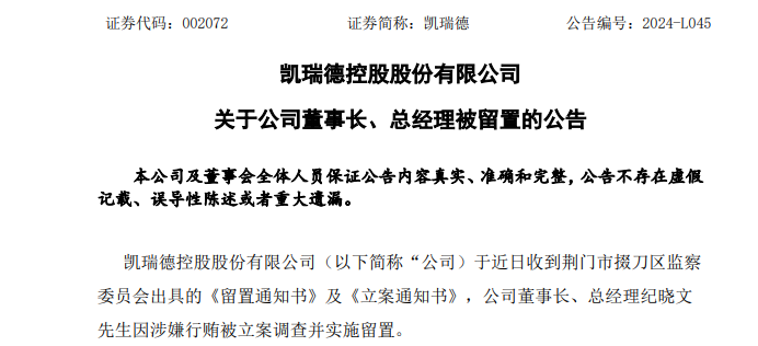 9月24日晚间,凯瑞德(002072)发布公告称,公司于近日收到荆门市掇刀区监察委员会出具的《留置通知书》及《立案通知书》,公司53岁董事长、总经理纪晓文因涉嫌行贿被立案调查并实施留置。