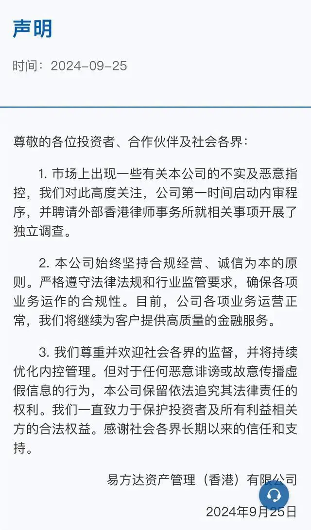 对此,易方达(香港)发布声明回应称,市场上出现一些有关公司的不实及恶意指控,公司对此高度关注,第一时间启动内审程序,并聘请外部香港律师事务所就相关事项开展了独立调查。易方达(香港)始终坚持合规经营、诚信为本的原则。严格遵守法律法规和行业监管要求,确保各项业务运作的合规性。