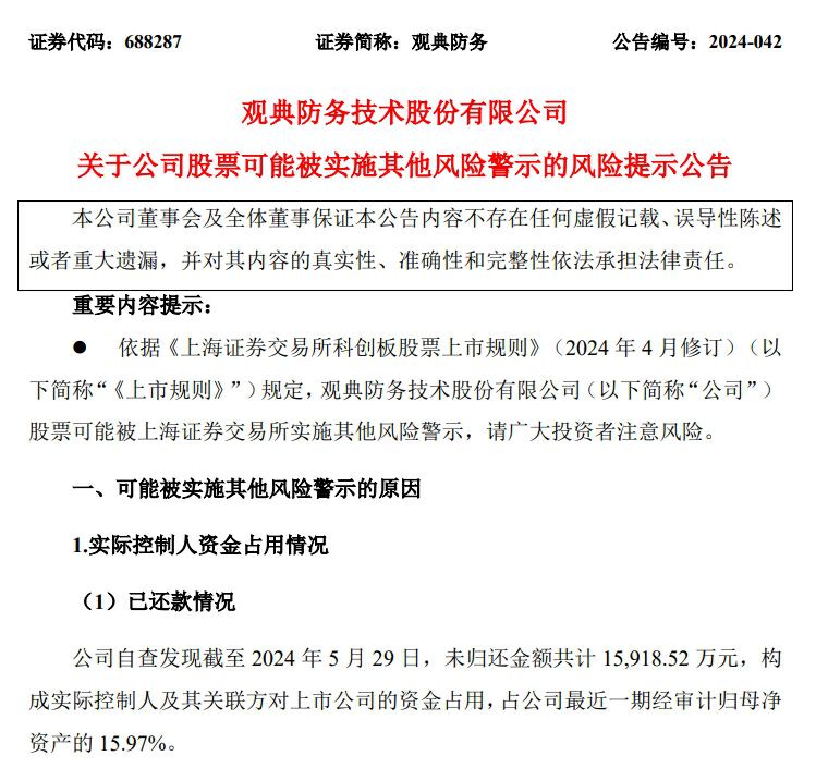 9月29日晚间,观典防务(688287)发布风险提示公告称,公司股票可能被上海证券交易所实施其他风险警示。