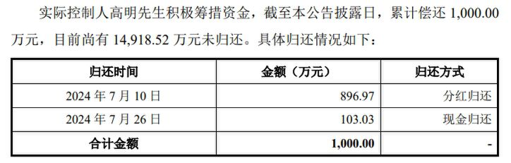 实际控制人高明先生已累计偿还1,000.00万元,目前尚有约1.49亿元未归还。高明先生及其近亲属已于2024年8月将其名下的房产等资产抵押给公司,作为偿还占用资金款项的担保物,市场价值预估5,500万元。