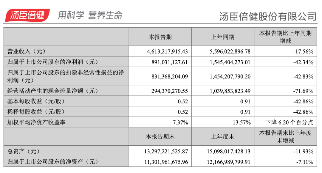 那么对于以健康为生意的保健品行业,什么是1,什么是0呢?最近,有着“保健品第一股”之称的老大哥汤臣倍健发布了2024半年报,营收与净利润双降,成为近十年来最差的一份半年报成绩单。早在2024年初,汤臣倍健发布2023年报时,董事长梁允超便在致辞中写道,2024年的关键词是“兑现”,要把此前变革和调整的结果在经营上去检验和兑现。显然,半年过去,这一“兑现”未能兑现。“保健品第一股”,卖不动了?汤臣倍健卖不动了,从2023年就开始了。根据汤臣倍健股份有限公司发布的2024半年报,报告期内公司实现营业收入 46.13 亿元,较上年同期下降 17.56%;归属于上市公司股东的净利润 8.91 亿元,较上年同期下降 42.34%。