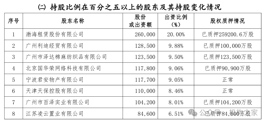 值得关注的是,渤海人寿股权结构中,质押现象普遍存在。在现有的17家股东中,除了即将被拍卖的0.62%股权外,还有10家股东的部分或全部持股处于质押状态。截至报告出具之日,渤海人寿已有88.58亿股股权被质押,占到了公司全部股权的68.14%。其中,公司持股5%以上的股东中,仅有两家股权处于正常状态,其余均全部被质押。