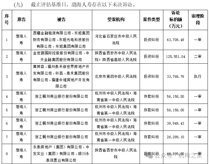 渤海人寿还面临着数亿元规模的多起诉讼:中天金融集团和金世旗国际控股的违约行为引发了股权收益权回购价款的追索诉讼;永泰房地产集团、中发实业集团和银川永泰鸿置业的信托投资项目在到期后,底层债务人逾期未偿,导致渤海人寿不得不通过诉讼来维护其权益;西藏金融租赁、东旭集团和东旭光电科技的同业拆借纠纷更是雪上加霜,借款到期后对方违约未还款,进一步暴露了渤海人寿在风险管理和资金回收方面的脆弱性。