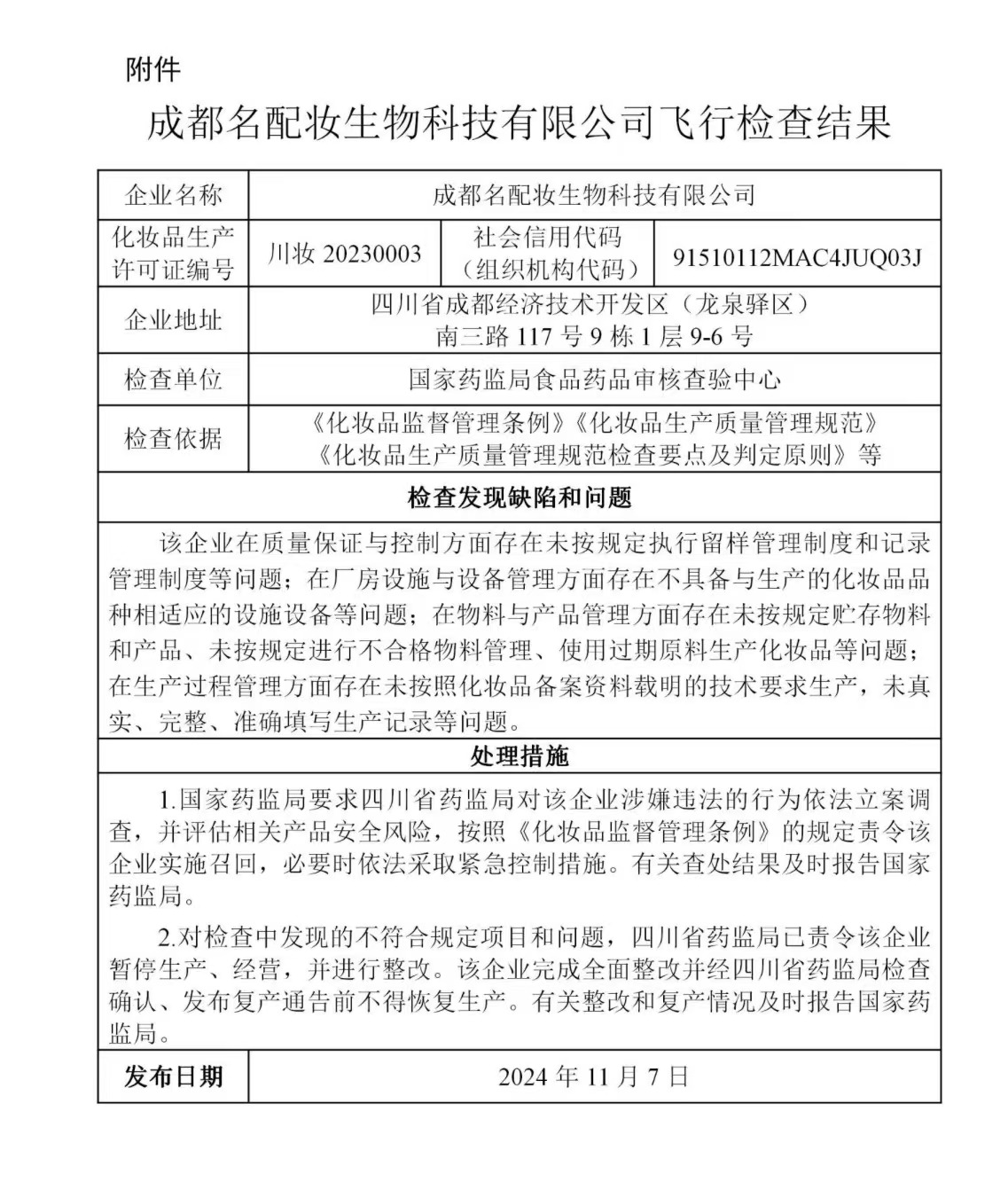 近期,国家药监局组织对成都名配妆生物科技有限公司进行飞行检查。经查,发现该企业违反《化妆品监督管理条例》《化妆品生产质量管理规范》等有关规定,生产质量管理体系存在严重缺陷。为保障公众用妆安全,国家药监局要求四川省药监局对该企业涉嫌违法行为依法查处。目前,四川省药监局已对该企业立案调查,并责令该企业暂停生产、经营,对存在的问题进行整改。具体情况见附件。