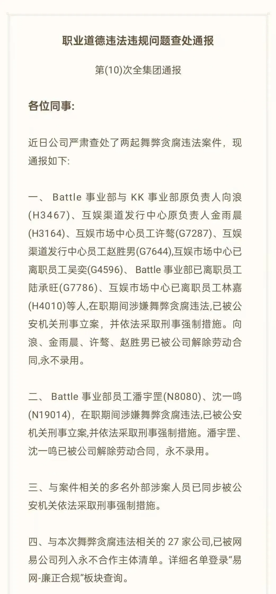 网易最新通报:9人已被采取刑事强制措施,27家公司永不合作