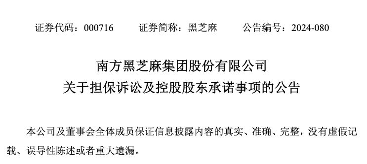 至于该案件对公司损益有何影响,黑芝麻表示,控股股东广西黑五类食品集团有限责任公司(以下简称“黑五类集团”)已就本事项作出兜底承诺:若公司因此造成的全部损失(具体以终审法院判决为准)其将全额承担,由此预计对公司损益不产生影响。但截至本公告披露日,黑五类集团尚未向公司支付履约保证金,该事项尚存在不确定性。若黑五类集团未能在2024年11月22日前向公司支付相应的承诺履约保证金的,公司的股票交易将被实施“其他风险警示”。