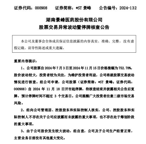 11月17日晚间,湖南景峰医药股份有限公司(以下简称“*ST景峰”、“景峰医药”或“公司”)发布股票交易异常波动暨停牌核查公告。公告称,公司股票自7月3日至11月15日价格涨幅为752.78%,股价波动较大,投资者较为关注,为维护投资者利益,公司将就股票交易波动情况进行核查。经公司申请,公司股票自2024年11月18日开市起停牌,待核查结束并披露相关公告后复牌,预计停牌时间不超过3个交易日。