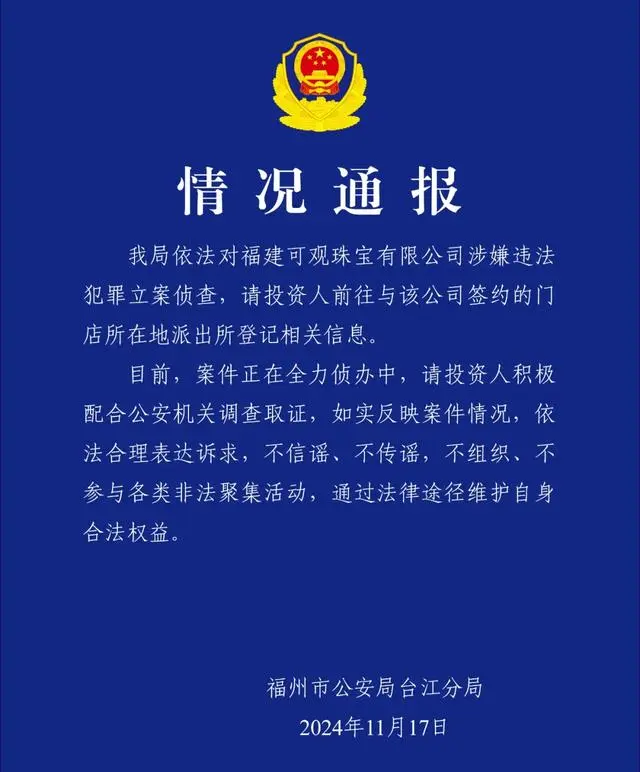 18日凌晨,“福州台江公安”微信公众号发布情况通报称,福州市公安局台州分局依法对福建可观珠宝有限公司涉嫌违法犯罪立案侦查,请投资人前往与该公司签约的门店所在地派出所登记相关信息。