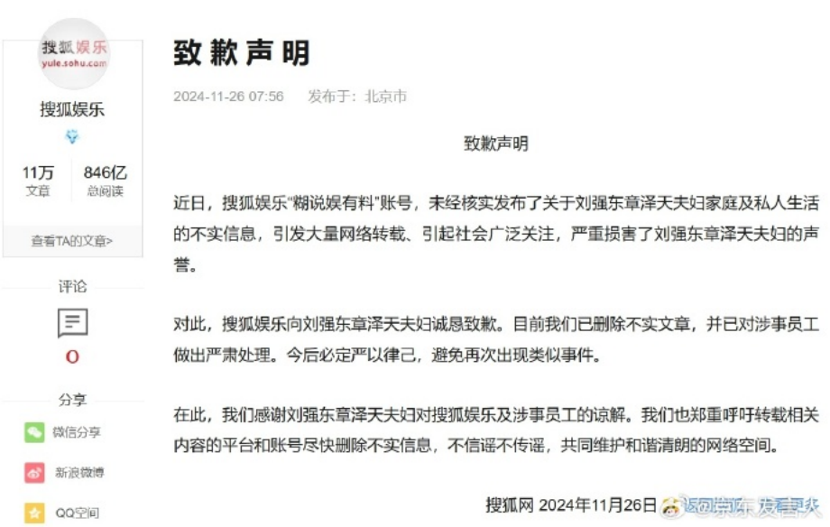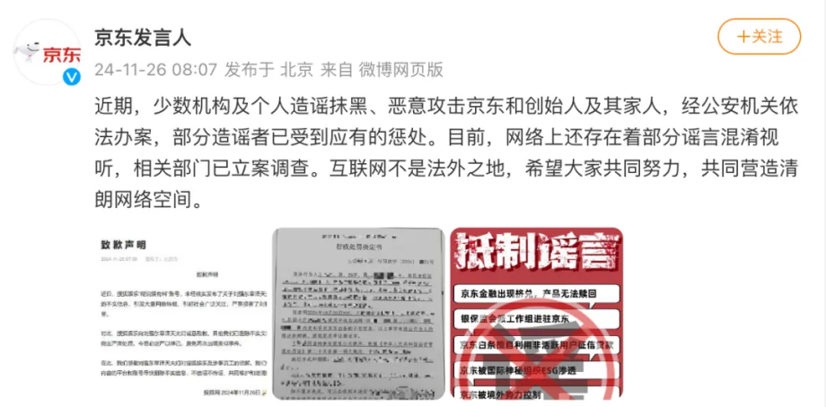 11月26日,京东发布声明称:近期,少数机构及个人造谣抹黑、恶意攻击京东和创始人及其家人,经公安机关依法办案,部分造谣者已受到应有的惩处。目前,网络上还存在着部分谣言混淆视听,相关部门已立案调查。互联网不是法外之地,希望大家共同努力,共同营造清朗网络空间。