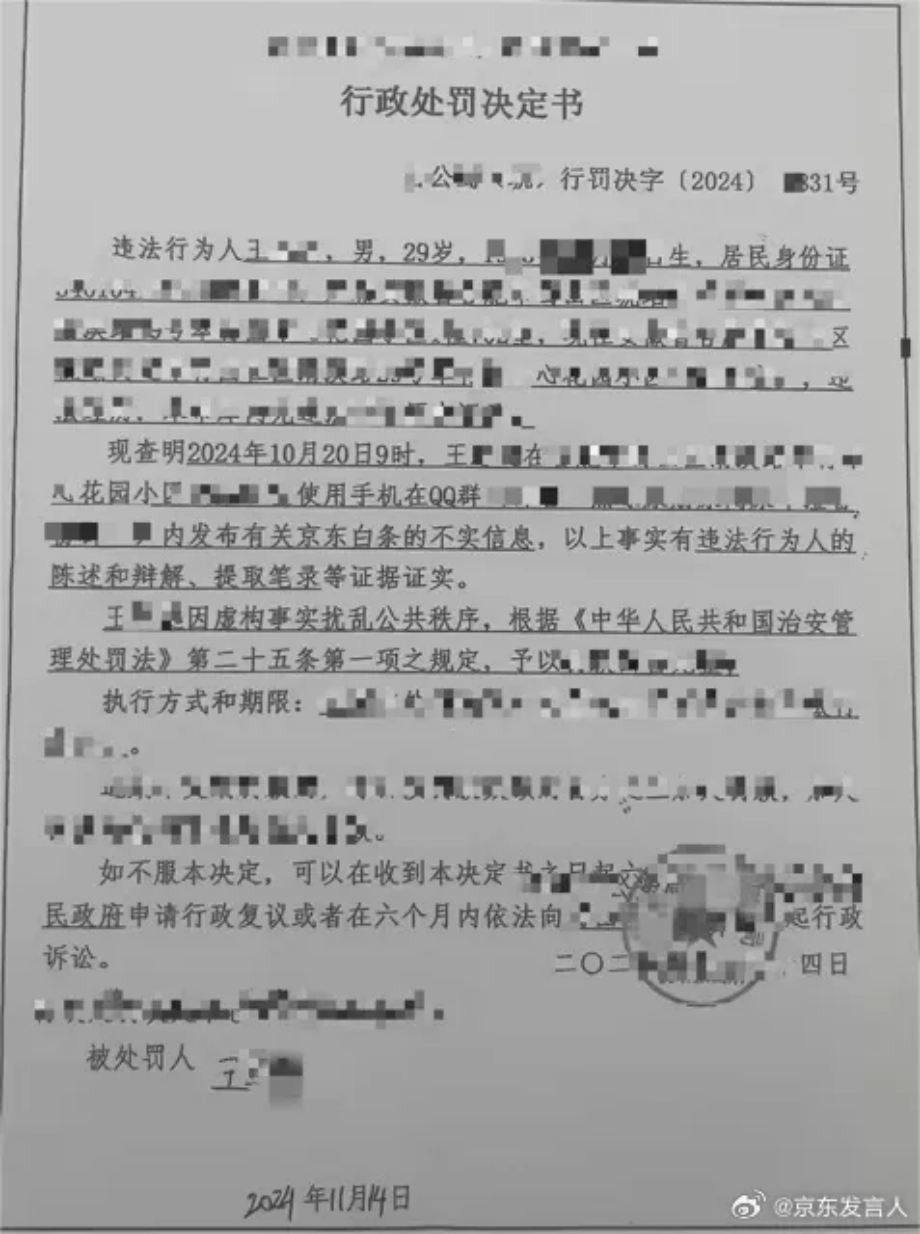京东公开的警方处罚决定书显示,王某在社交软件上发布有关于京东白条的不实信息,因虚构事实、扰乱公共秩序已被警方处理。另外,其他谣言也已在立案调查中。