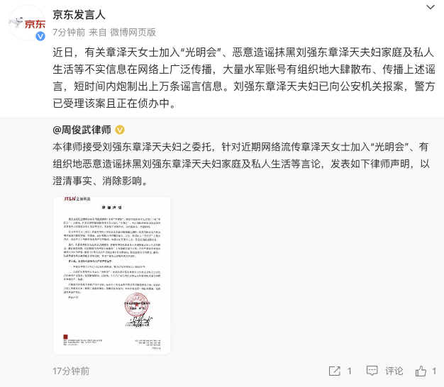 10月16日,@京东发言人 发布声明称,近日,有关章泽天女士加入“光明会”、恶意造谣抹黑刘强东章泽天夫妇家庭及私人生活等不实信息在网络上广泛传播,大量水军账号有组织地大肆散布、传播上述谣言,短时间内炮制出上万条谣言信息。刘强东章泽天夫妇已向公安机关报案,警方已受理该案且正在侦办中。