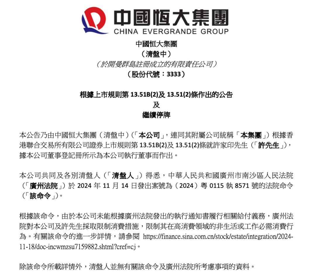 中国恒大(03333.HK)11月26日晚间在港交所公告,广州市南沙区人民法院11月14日发出案号为(2024)粤0115执8571号的法院命令。