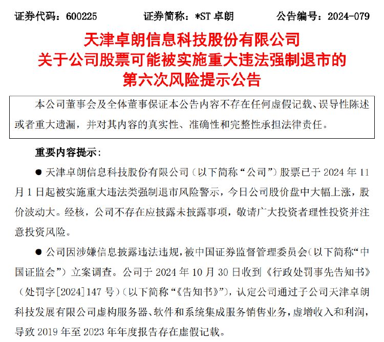 公告显示,*ST卓朗因涉嫌信息披露违法违规,被中国证监会立案调查。公司于2024年10月30日收到《告知书》,认定公司通过子公司天津卓朗科技发展有限公司虚构服务器、软件和系统集成服务销售业务,虚增收入和利润,导致2019年至2023年年度报告存在虚假记载。