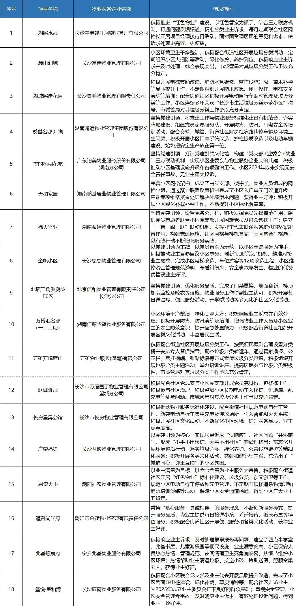 长沙市物业管理办公室相关负责人表示,各区、县(市)行业主管部门要将本季度物业服务企业信用评价情况在“住建一体化”信息平台上予以记录,作为企业诚信评分、评优评先的重要参考。长沙市物业服务企业应加强党建引领,全面提升服务理念,提高服务品质,营造更加美好、和谐的小区环境,有效提升市民满意度,不断增强居民获得感、幸福感、安全感,推动长沙物业行业高质量发展。