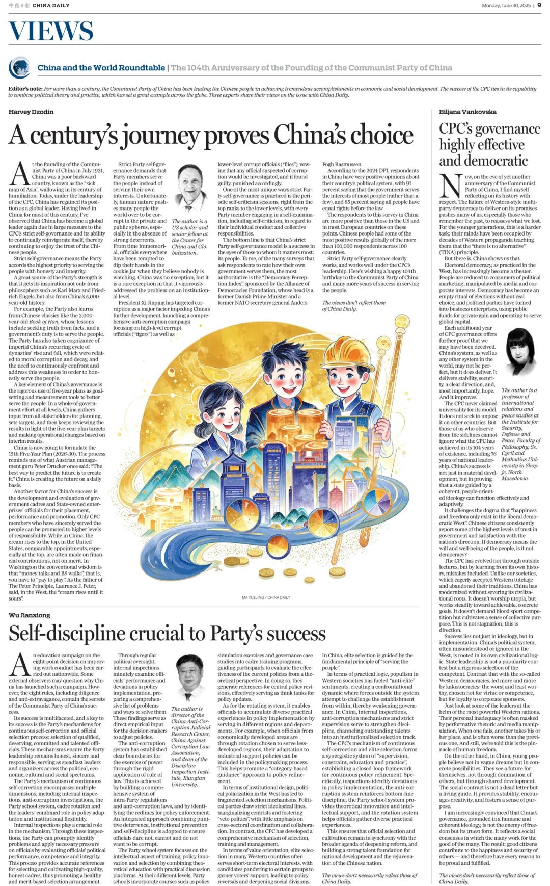 美籍专家哈维佐丁在《一个世纪的历程证明了中国的选择》一文中指出,1921年7月中国共产党成立时,中国是一个贫穷落后的国家,这个曾被蔑称为“东亚病夫”的国家,正深陷百年屈辱的泥沼。如今,在中国共产党的领导下,中国已重回全球重要领导者的行列。我在本世纪的大部分时间都生活在中国,亲眼见证了这一复兴历程——中国之所以能再度崛起,很大程度上得益于中国共产党以严格的自我革命精神持续革新,从而始终赢得人民的信任与支持。