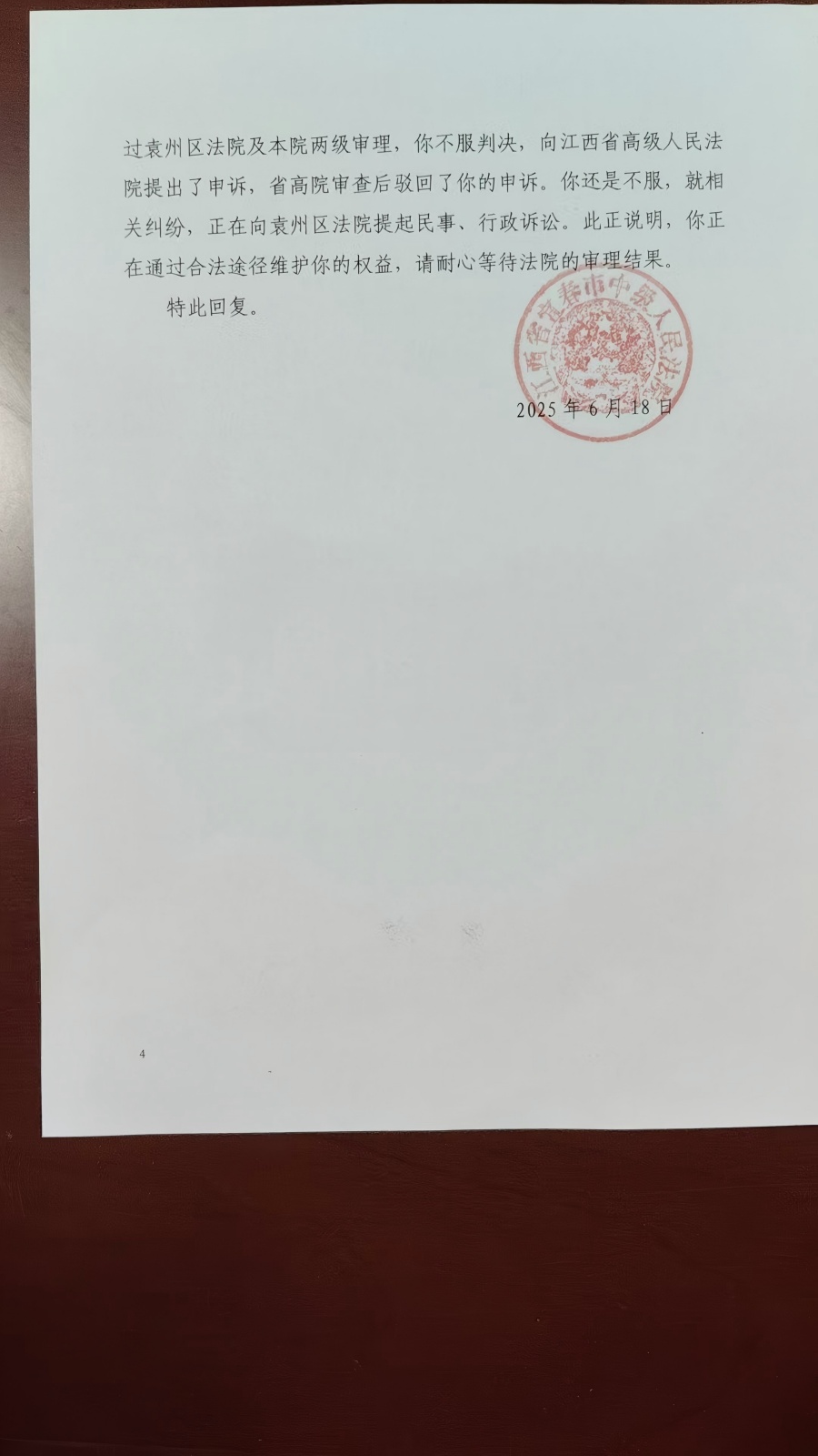 本人卢胜和,现针对贵院于2025年6月18日作出的宜法信字(2025)34号信访回复函提出如下异议: