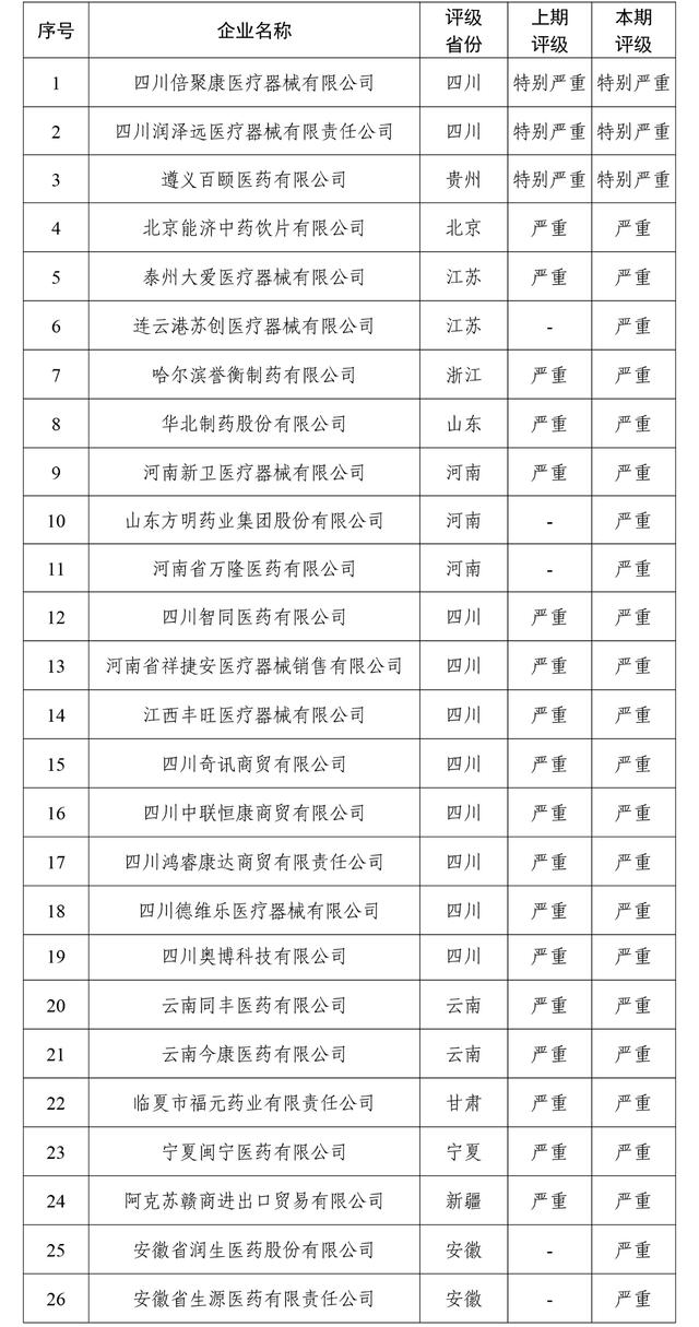 上述结果显示,3家被评定为“特别严重”的医药企业分别为四川倍聚康医疗器械有限公司、四川润泽远医疗器械有限责任公司、遵义百颐医药有限公司。