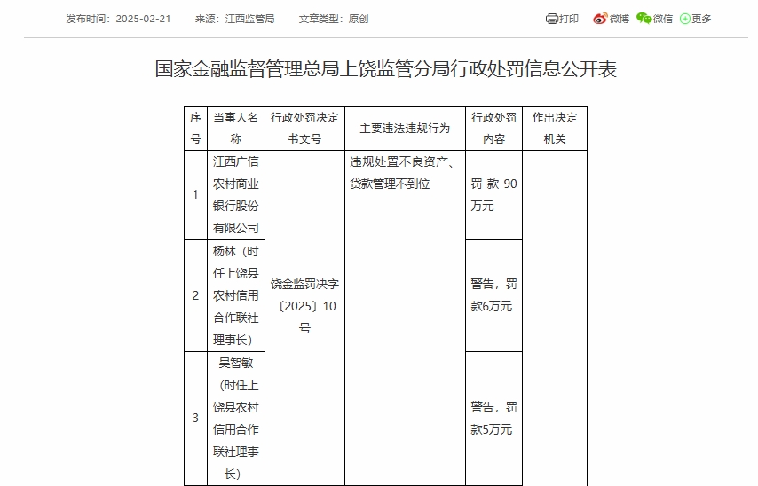 具体来看,江西广信农商银行因违规处置不良资产、贷款管理不到位,被罚款90万元。杨林(时任上饶县农村信用合作联社理事长)、吴智敏(时任上饶县农村信用合作联社理事长)被警告,并分别被罚款6万元和5万元。
