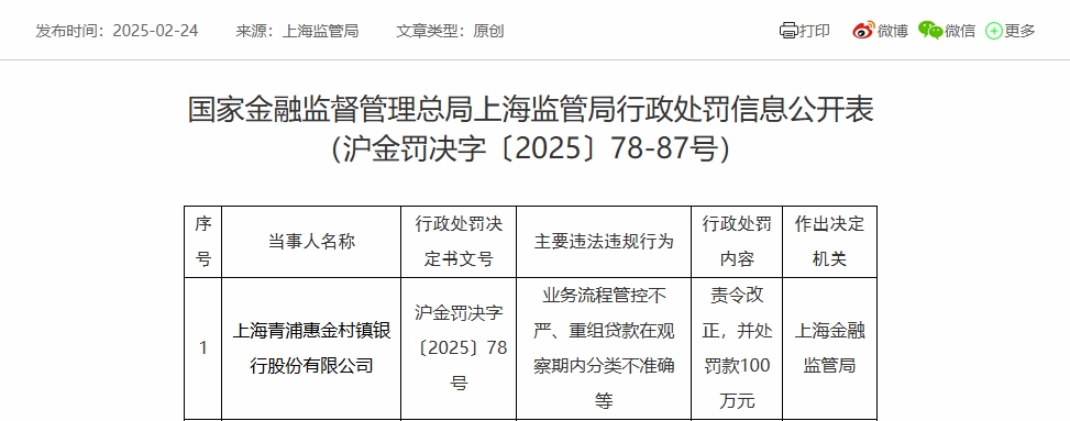 2月24日,国家金融监督管理总局上海监管局披露的行政处罚信息公开表显示,上海青浦惠金村镇银行股份有限公司因业务流程管控不严、重组贷款在观察期内分类不准确等,被罚款100万元。
