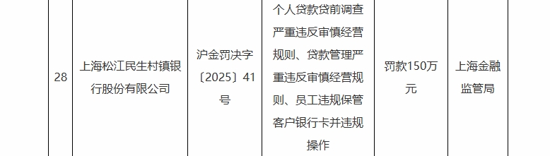 除上海青浦惠金村镇银行外,2月8日,国家金融监督管理总局上海监管局发布一批罚单显示,上海松江民生村镇银行股份有限公司因个人贷款贷前调查严重违反审慎经营规则、贷款管理严重违反审慎经营规则、员工违规保管客户银行卡并违规操作,被罚款150万元。时任上海松江民生村镇银行九亭支行副行长赵绅旭、新桥支行客户经理李云被警告。