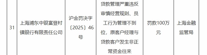 上海浦东中银富登村镇银行因存在贷款管理严重违反审慎经营规则、员工行为管理不到位,原客户经理与贷款客户发生非正常资金往来等违法违规行为,被处罚款100万元。时任该行公司部客户经理孙文强对贷款管理严重违反审慎经营规则负有责任,被予以警告;时任该行零售一部客户经理裴凯对员工行为管理不到位,原客户经理与贷款客户发生非正常资金往来负有责任,被禁止从事银行业工作三年。