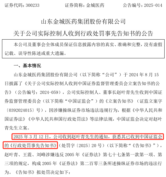 3月12日,金城医药(300233)发布公告,公司实际控制人、董事长赵叶青先生收到中国证监会的《行政处罚事先告知书》的公告,因涉嫌操纵证券市场,赵叶青等人被合计罚没约6176万元,市场禁入4年。