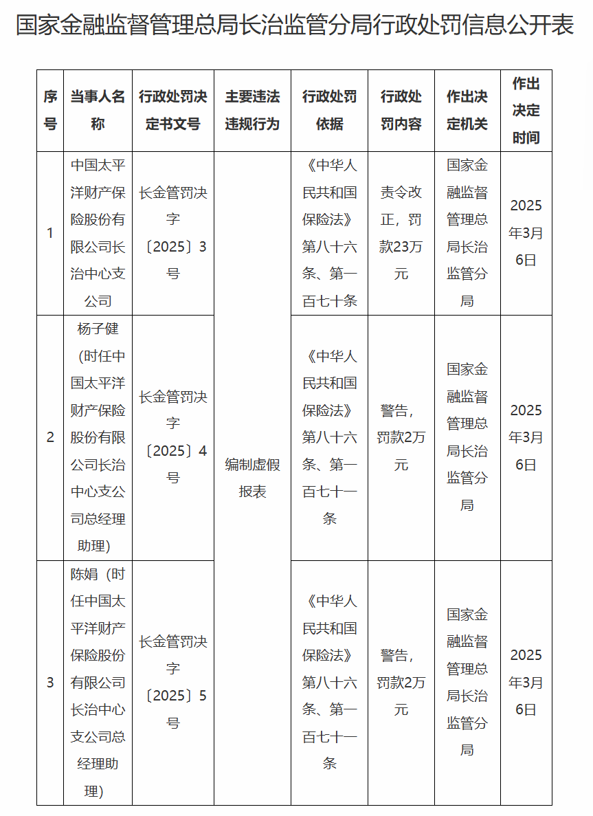 3月17日,国家金融监督管理总局发布处罚信息,因编制虚假报表,中国太平洋财产保险股份有限公司长治中心支公司被责令改正,罚款23万元,杨子健(时任中国太平洋财产保险股份有限公司长治中心支公司总经理助理)和陈娟(时任中国太平洋财产保险股份有限公司长治中心支公司总经理助理)分别被警告,罚款2万元。