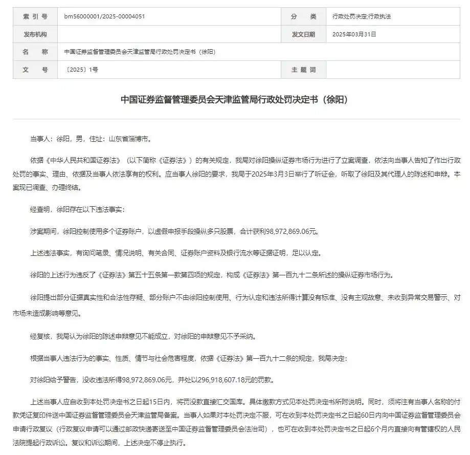 近日,天津证监局新增一份行政处罚决定书,因操纵证券市场,徐阳被没一罚三,合计罚没收入约3.96亿元。