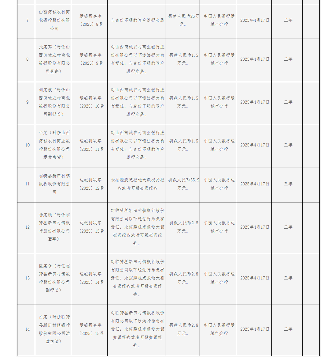 此次处罚中涉及8家农商行,累计收到27张罚单。从违法行为类型来看,客户身份识别违规问题最为突出,多家银行因未落实客户身份识别制度被重罚。山西蒲县、浮山、翼城、隰县农村商业银行股份有限公司均未按规定开展持续的客户身份识别,其中蒲县农商行因此被罚款56.26万元,浮山、翼城、隰县农商行分别被罚款23.4万元、23.3万元、23.4万元,相关责任人各被罚款1.5万元。山西运城农村商业银行股份有限公司(简称:山西运城农商行)未按照规定履行客户身份识别义务,被罚款115.868万元,时任行长、董事陈某生和反洗钱专管员郝某霞各被罚款1.5万元。山西平陆农村商业银行股份有限公司未按规定对高风险客户采取强化识别措施,被罚款25万元,相关责任人郑某峰、王某、吴某各被罚款1.5万元。山西芮城农村商业银行股份有限公司与身份不明的客户进行交易,被罚款25万元,相关责任人张某萍、刘某波、牛某各被罚款1.5万元。