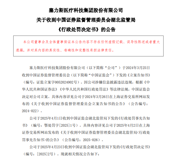4月24日,塞力医疗(603716.SH)公告称收到湖北证监局《行政处罚决定书》。因2019年至2022年上半年未按规定披露关联交易及资金占用、未及时披露重要股权转让协议,公司被罚600万元,时任董事长温伟等9名责任人合计被罚1185万元。此次罚单合计1785万元,创下医疗集约化服务领域近五年最高纪录。尽管公司声称“生产经营正常”,但连年亏损、资金链紧绷及三度募集资金违约等风险,已让这家“华为AI医疗概念股”深陷泥潭。