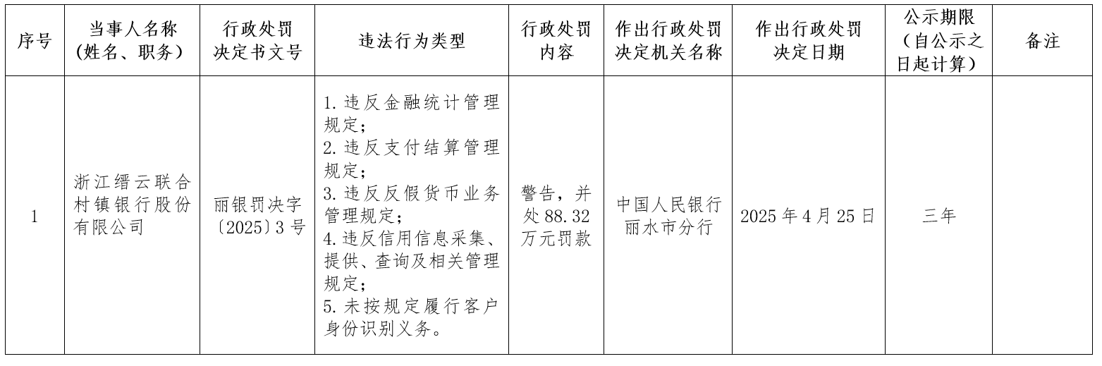 5月7日,中国人民银行丽水市分行行政处罚信息公示表显示,浙江缙云联合村镇银行因违反金融统计管理规定,违反支付结算管理规定,违反反假货币业务管理规定,违反信用信息采集、提供、查询及相关管理规定,以及未按规定履行客户身份识别义务等五项违法行为,被警告并罚款88.32万元。