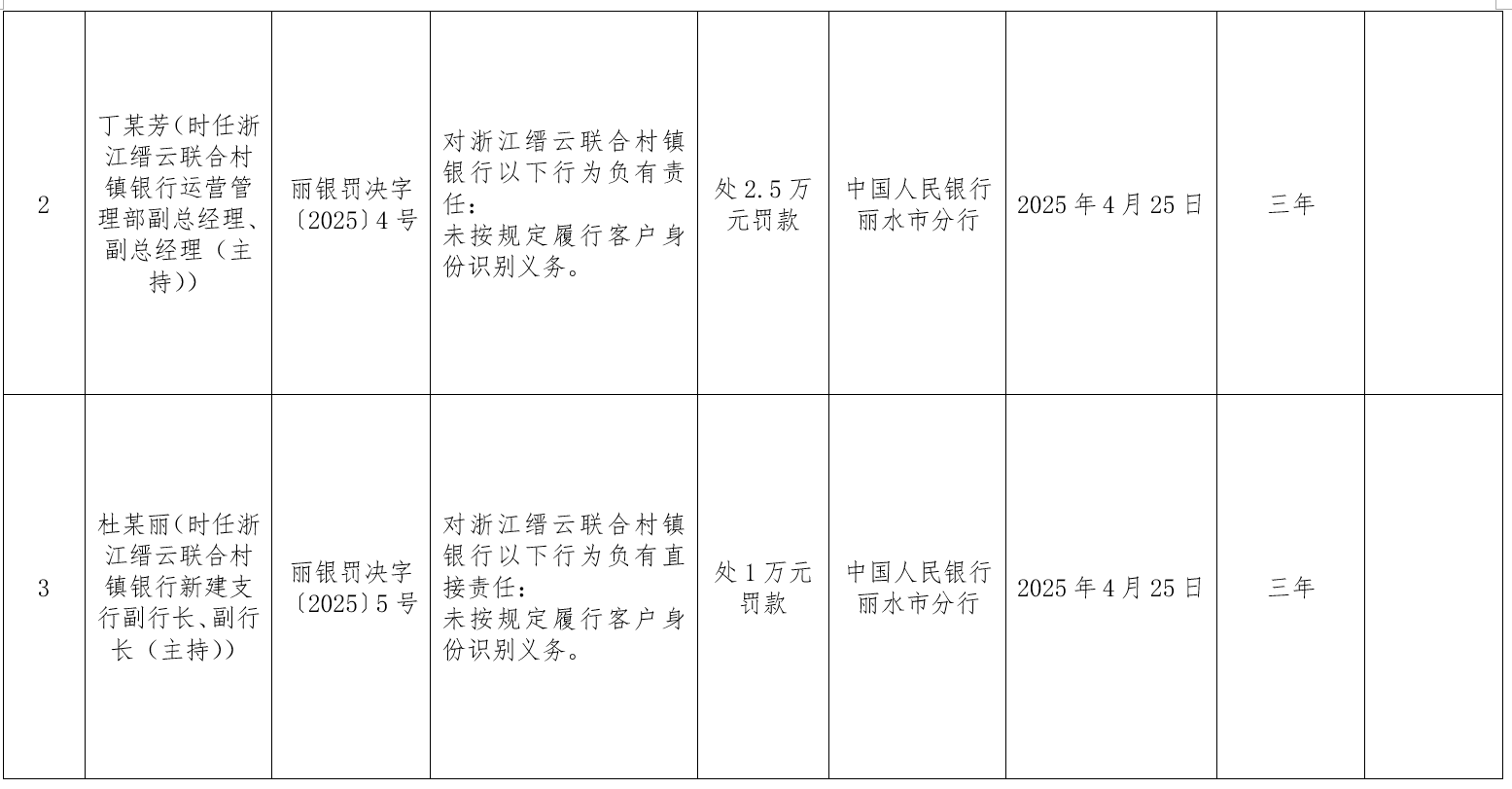 丁某芳(时任浙江缙云联合村镇银行运营管理部副总经理、副总经理(主持))因对浙江缙云联合村镇银行未按规定履行客户身份识别义务负有责任被罚2.5万元;杜某丽(时任浙江缙云联合村镇银行新建支行副行长、副行长(主持))因对浙江缙云联合村镇银行未按规定履行客户身份识别义务负有直接责任被罚1万元。