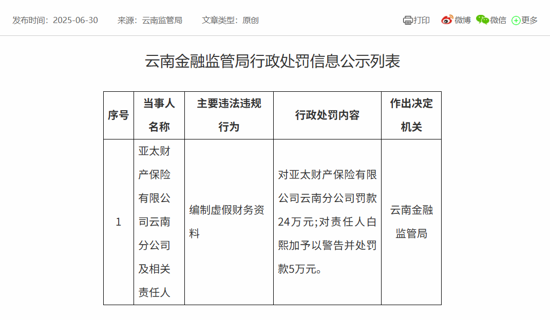 6月30日,国家金融监管局公布处罚信息,因编制虚假财务资料,云南金融监管局对对亚太财产保险有限公司云南分公司罚款24万元;对责任人白熙加予以警告并处罚款5万元。