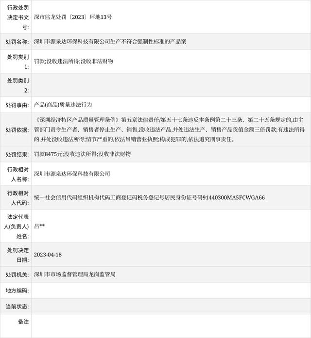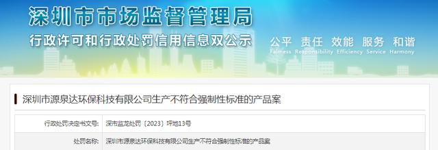 近日,深圳市市场监督管理局龙岗监管局公布一条行政处罚信息,涉及深圳市源泉达环保科技有限公司生产不符合强制性标准的产品案。具体信息如下: