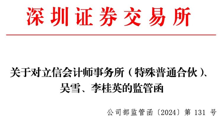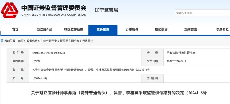 据证监会网站消息,7月9日,辽宁证监局发布《关于对立信会计师事务所(特殊普通合伙)、吴雪、李桂英采取监管谈话措施的决定〔2024〕8号》(下称《监管谈话》)。同日,深交所也发布《关于对立信会计师事务所(特殊普通合伙)、吴雪、李桂英的监管函》(下称《监管函》)。