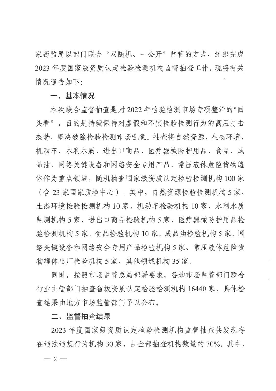 市场监管总局、公安部、自然资源部、生态环境部、交通运输部、水利部、海关总署、国家药监局以部门联合“双随机、一公开”监管的方式,组织完成2023年度国家级资质认定检验检测机构监督抽查工作。现将有关结果通告如下:
