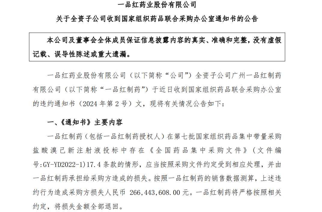 尽管一品红并非第一个在集采过程中被认定违规的企业,但其涉及的违约金额在已公开的案例中为最高。