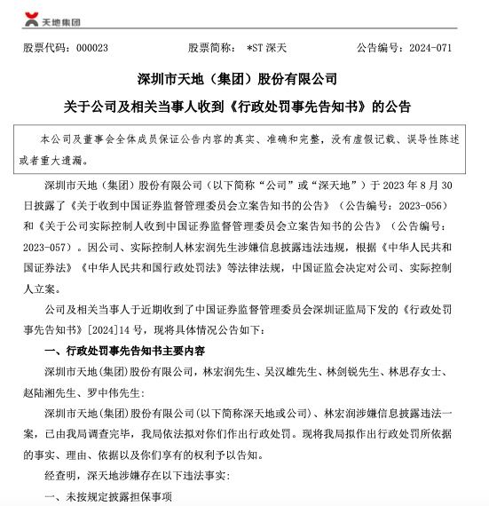 8月4日,深圳市天地(集团)股份有限公司(以下简称“*ST深天”或“公司”)发布关于公司及相关当事人收到《行政处罚事先告知书》的公告。公告称,公司及其相关当事人最近收到了中国证监会行政处罚事先告知,因涉嫌信息披露违法违规。中国证监会决定对公司及实际控制人立案,公司可能面临最高罚款400万元,实际控制人林宏润可能面临最高罚款800万元。其他相关当事人也可能面临罚款。