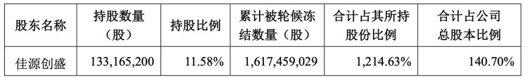 2021年12月27日至2022年10月11日期间,佳源创盛及其一致行动人浙江佳源房地产集团有限公司(以下简称“浙江佳源”)所持公司股份被多家法院司法冻结及轮候冻结。其中,2022年5月9日,佳源创盛及浙江佳源持有的1.26亿股公司股份被冻结,占公司总股本的15.31%,累计超过5%。