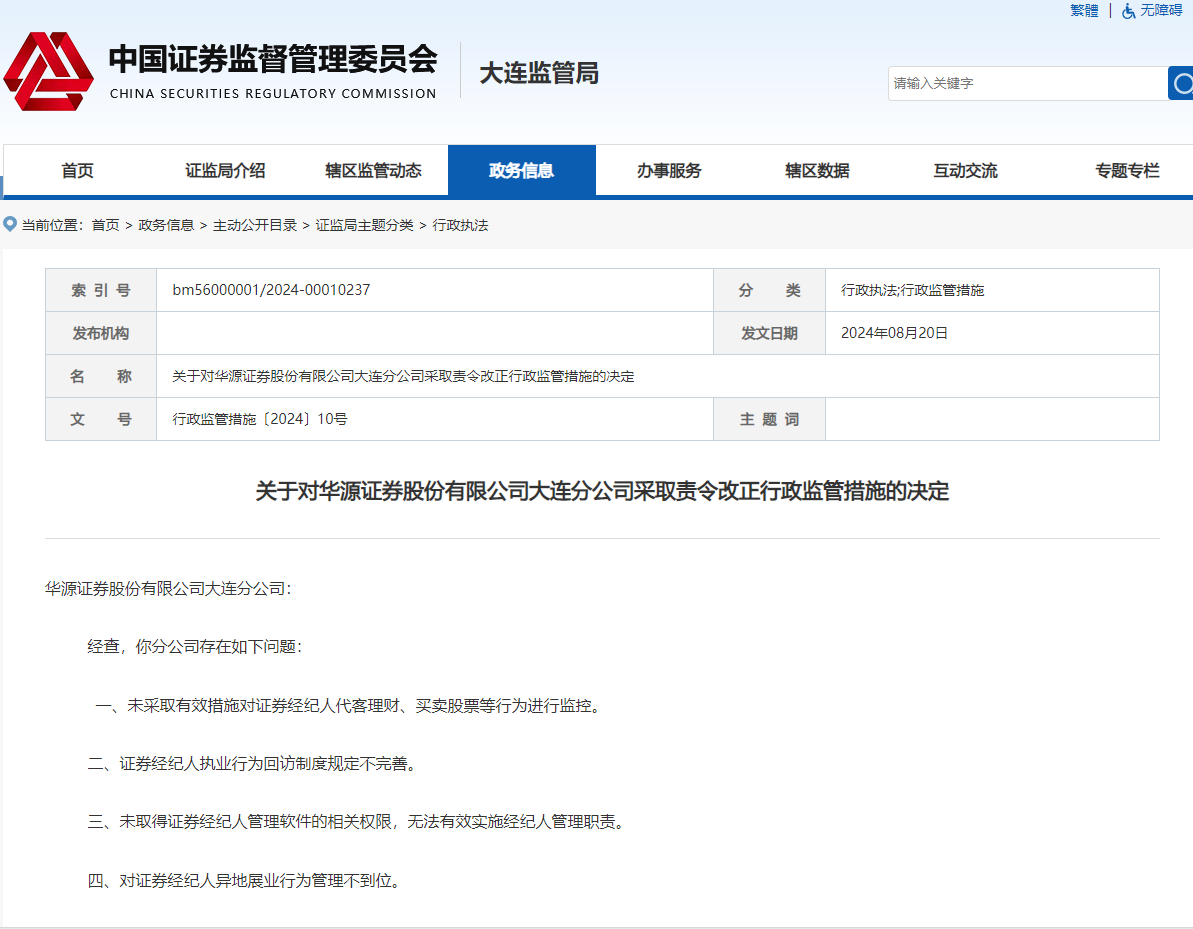 8月20日,大连证监局公告,对华源证券大连分公司采取责令改正行政监管措施。