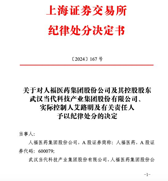 9月3日晚间,上海证券交易所下发关于对人福医药集团股份公司(以下简称“人福医药”或“公司”)及其控股股东武汉当代科技产业集团股份有限公司、实际控制人艾路明及有关责任人予以纪律处分的决定。