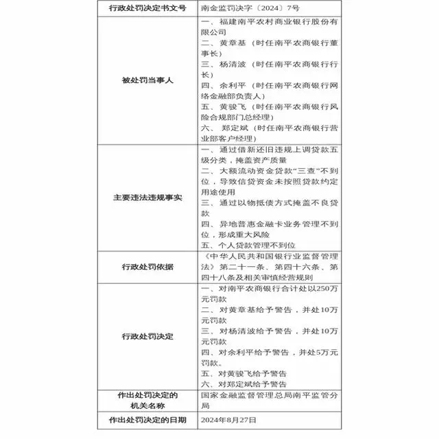 国家金融监督管理总局福建监管局依据《中华人民共和国银行业监督管理法》第二十一条、第四十六条、第四十八条及相关审慎经营规则决定:一、对南平农商银行合计处以250万元罚款二、对黄章基给予警告,并处10万元罚款三、对杨清波给予警告,并处10万元罚款四、对余利平给予警告,并处5万元罚款。五、对黄骏飞给予警告六、对郑定斌给予警告 。