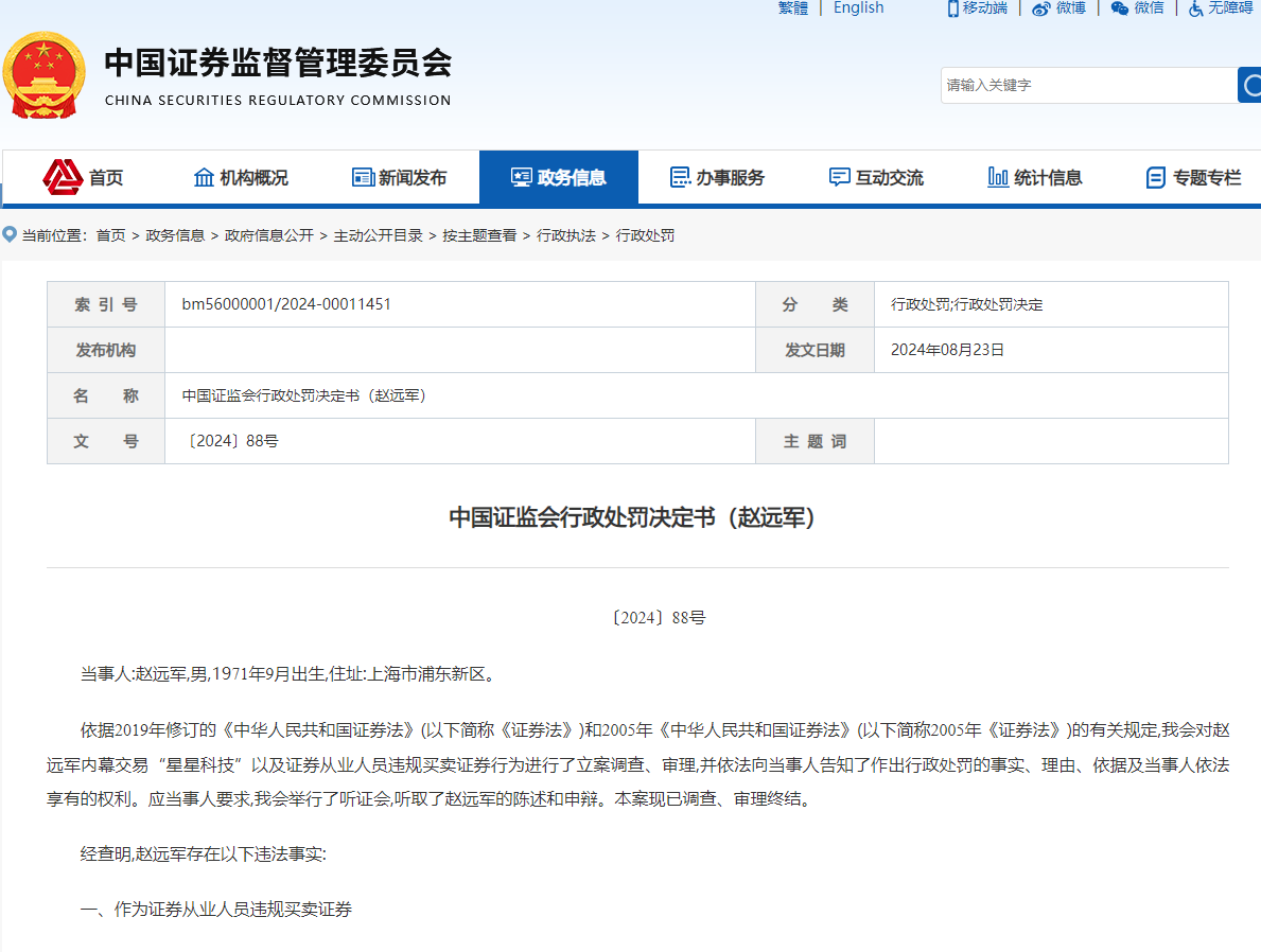8月23日,中国证监会公布了一起内幕交易重大处罚案例,光大证券原投资银行总部总经理赵远军因内幕交易星星科技股票,被处以460万元罚款,并遭受10年证券市场禁入的严厉处罚。