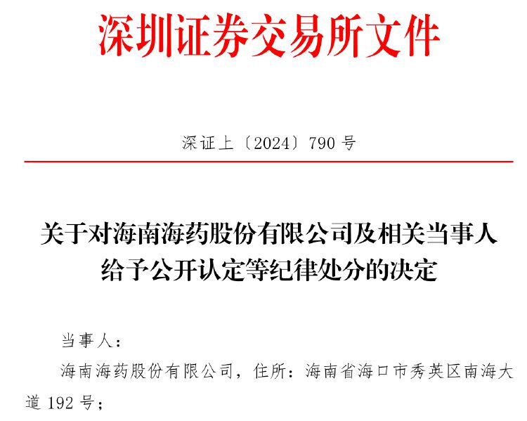 今日,深交所官网显示,深交所发布关于对海南海药(000566)及相关当事人给予公开认定等纪律处分的决定。